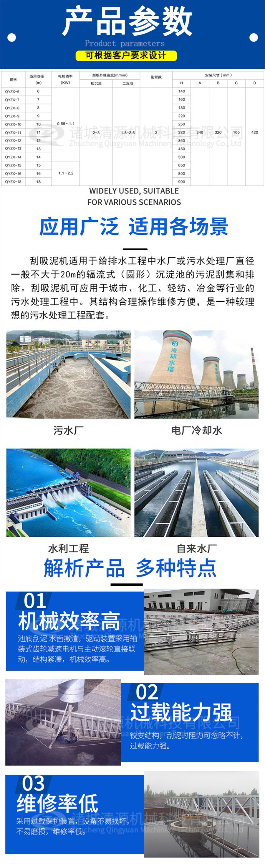 半橋式周邊傳動刮泥機用于污水處理廠圓形沉淀池,將沉淀在池底上的污泥刮集至積泥坑,以便污泥回流和濃縮脫水;并將吃面浮渣撇向集渣斗,通過浮渣漏斗排出池外,以便進一步處理。
