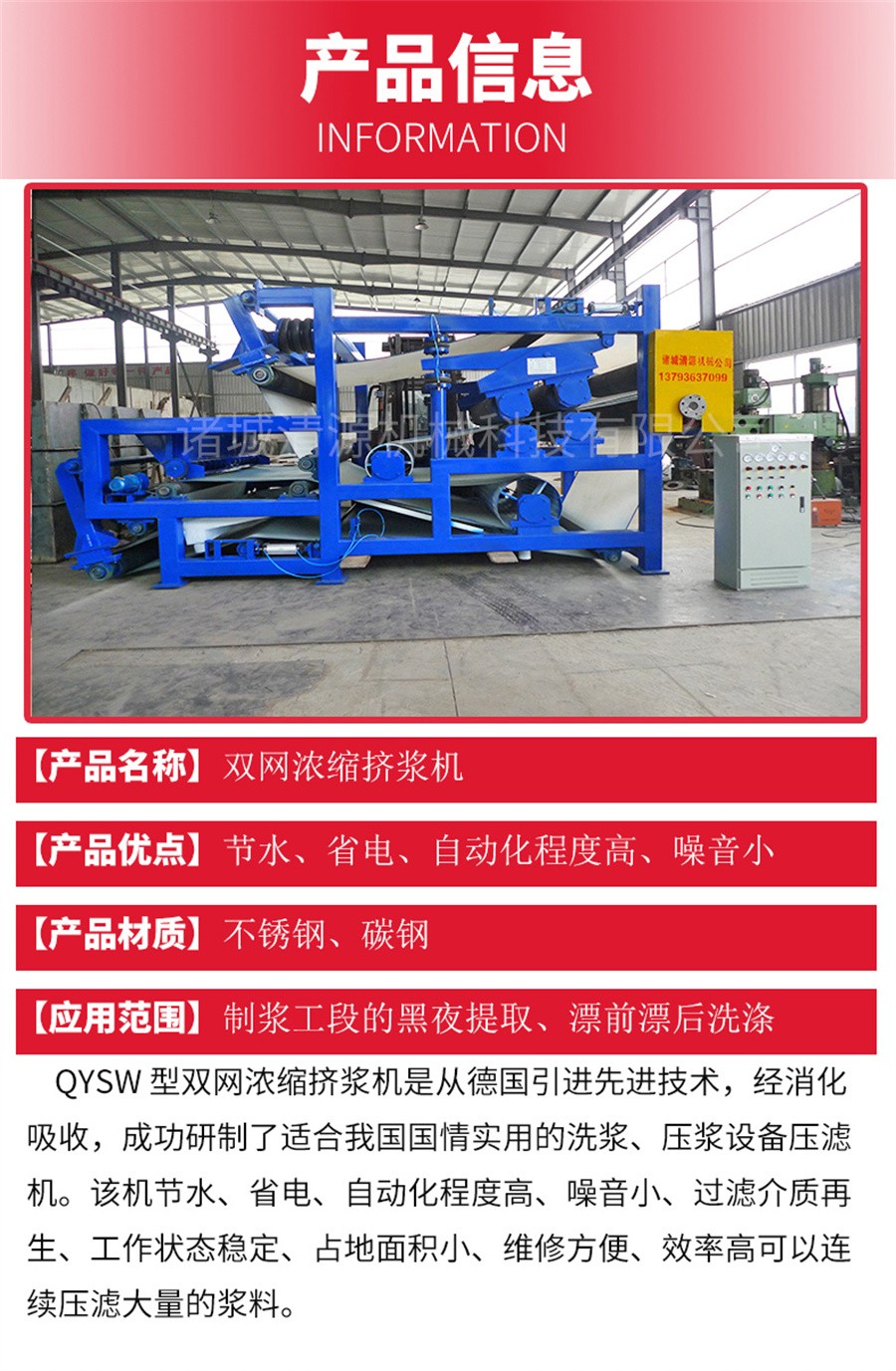 ZSW 型雙網濃縮擠漿機是從德國引進先進技術,經消化吸收,成功研制了適合我國國情實用的洗漿、壓漿設備壓濾機。該機節水、省電、自動化程度高、噪音小、過濾介質再生、工作狀態穩定、占地面積小、維修方便、效率高可以連續壓濾大量的漿料,產品采用高強度材料制作,具有處理能力大,脫水效率高,使用壽命長等顯著特點,本設備廣泛應用于制漿工段的黑夜提取、漂前漂后洗滌、商品漿的壓縮儲運及渣漿濃縮。其配備的軸承使用壽命長,同時采用高品質的濾帶,確保壓漿機的性能和品質。